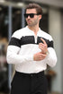 Beyaz Fermuarlı Polo Yaka Çizgili Uzun Kollu Kazak E7288