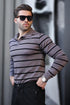 Gri Düğmeli Polo Yaka Çizgili Uzun Kollu Kazak 7263