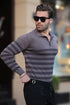 Gri Düğmeli Polo Yaka Çizgili Uzun Kollu Kazak 7270